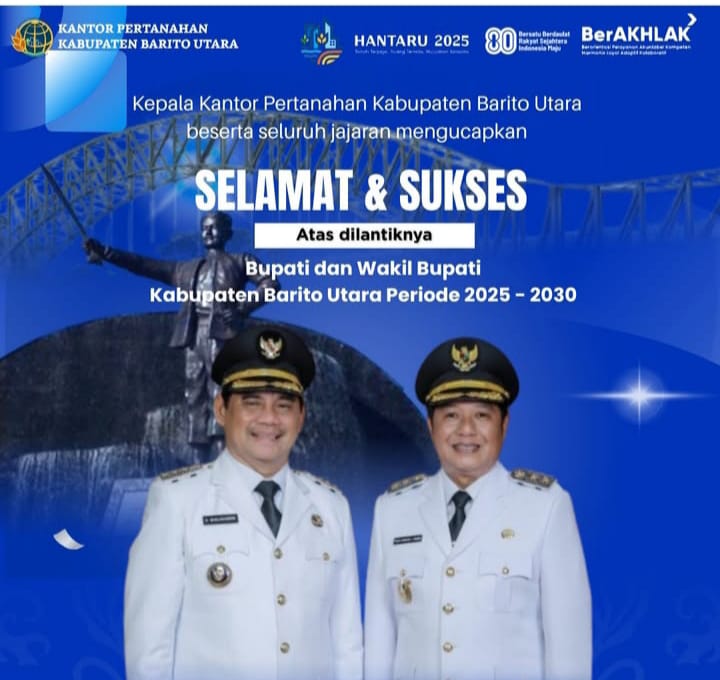 MUARA TEWEH, neonusantara.id – Dukungan terhadap kepemimpinan baru Kabupaten Barito Utara terus mengalir dari berbagai pihak. Salah satunya datang dari Kantor Pertanahan (Kantah) Kabupaten Barito Utara yang menyampaikan ucapan selamat dan sukses atas pelantikan H. Shalahuddin, S.T., M.T. sebagai Bupati dan Felix Sonadie Y. Tingan, A.Md. sebagai Wakil Bupati Barito Utara periode 2025-2030.